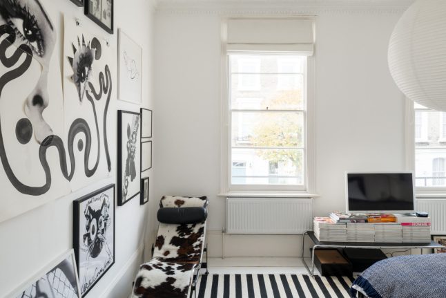 Phòng ngủ vẫn giữ nguyên gam màu chủ đạo của ngôi nhà. Chiếc thảm kẻ sọc đen trắng giúp căn phòng thêm cá tính và bớt đơn điệu hơn
