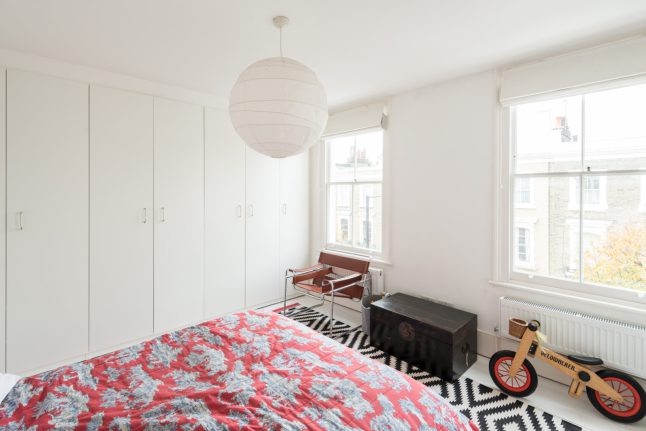 Phòng ngủ của trẻ rất gọn gàng và không có quá nhiều đồ nội thất. Chiếc tủ trắng lớn kéo dài dọc theo bức tường, đáp ứng yêu cầu lưu trữ lớn của gia chủ