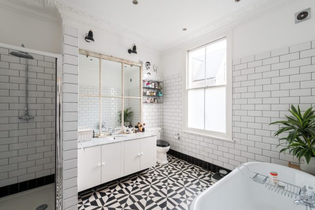 Nhà vệ sinh sạch sẽ, sáng sủa, gam màu đen - trắng đan xen nhau, chiếc tường trắng được trang trí theo kiểu những hàng gạch xếp chồng lên nhau, tạo điểm mới mẻ cho căn phòng.