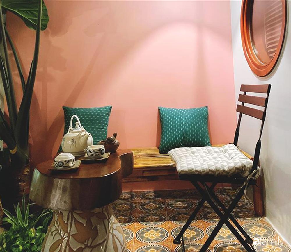 Điểm nhấn đặc biệt của ngôi nhà là góc tường hồng ngay tại tầng 1. Đây là không gian mà mọi thành viên trong gia đình đều cảm thấy thích thú. Vợ chồng chị Sương Nhi đặt bộ bàn ghế để mọi người có thể uống trà, đọc sách, thư giãn…
