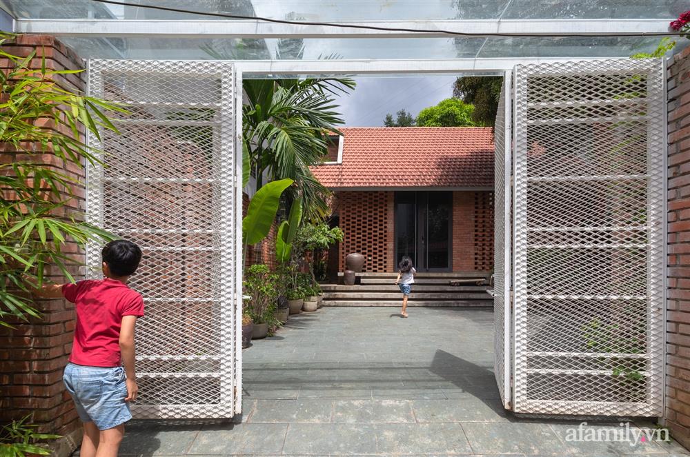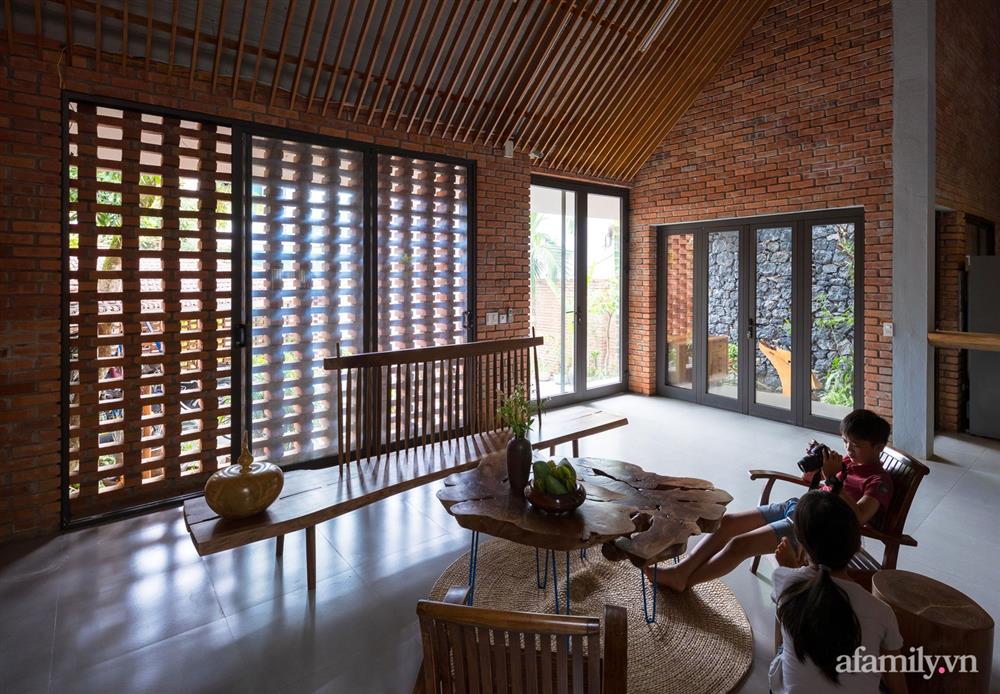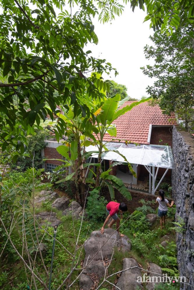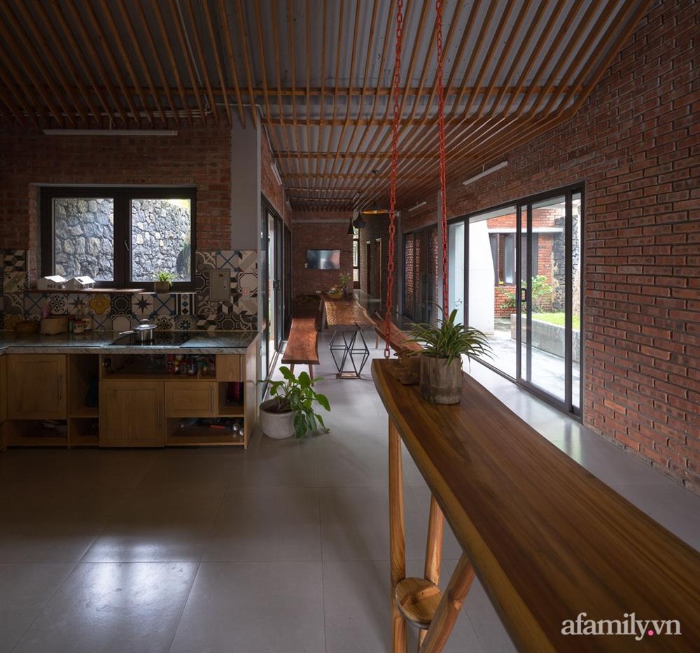 Toàn bộ ngôi nhà được xây dựng bằng gạch đỏ không trát, mái lợp ngói đỏ đậm chất miền quê Bắc Bộ. Những ô cửa được mở tối đa giúp không gian bên trong hòa mình tuyệt đối với thiên nhiên bên ngoài. Dù ngồi ở bất kỳ vị trí nào, bạn cũng có thể nhìn thấy một khoảng sân, bóng cây và những bức tường đá xám.