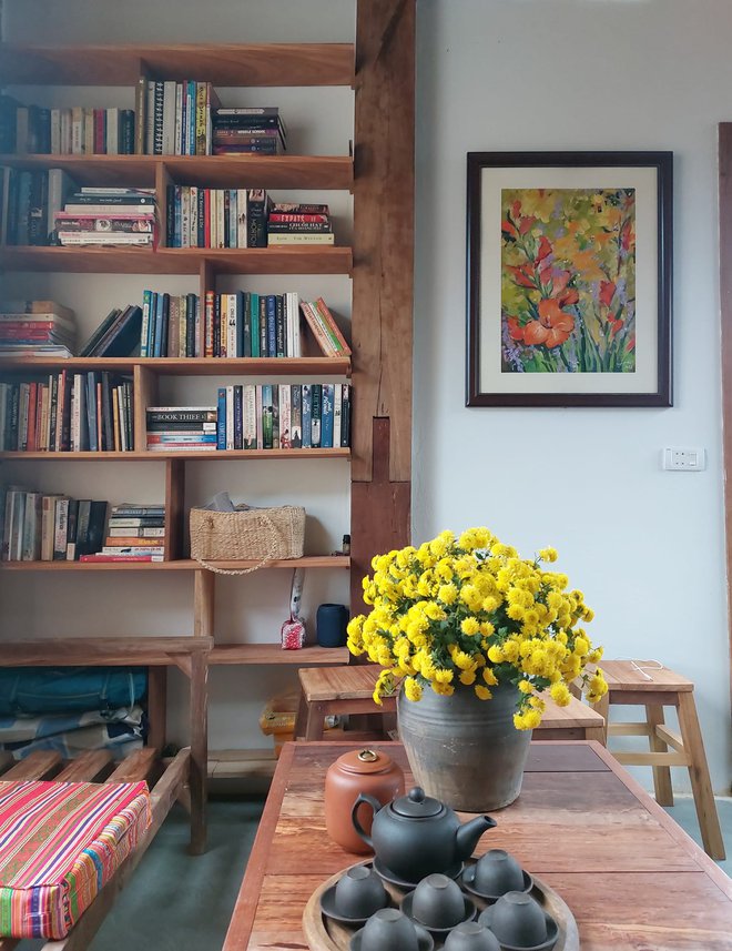 Thời điểm này cũng là vừa tròn một năm trên hành trình (tạm) bỏ phố về rừng của chị Thu Hương. Ngày này năm ngoái chị dọn về ở ngôi nhà gỗ nằm ở lưng đồi này, khi đó sân vườn còn trống trơ và ngổn ngang đất cát. Hôm nay, quanh nhà đã nở đầy hoa vàng và chim hót ríu ran. Có vườn rau nho nhỏ cung cấp những bữa rau hữu cơ ngon lành.