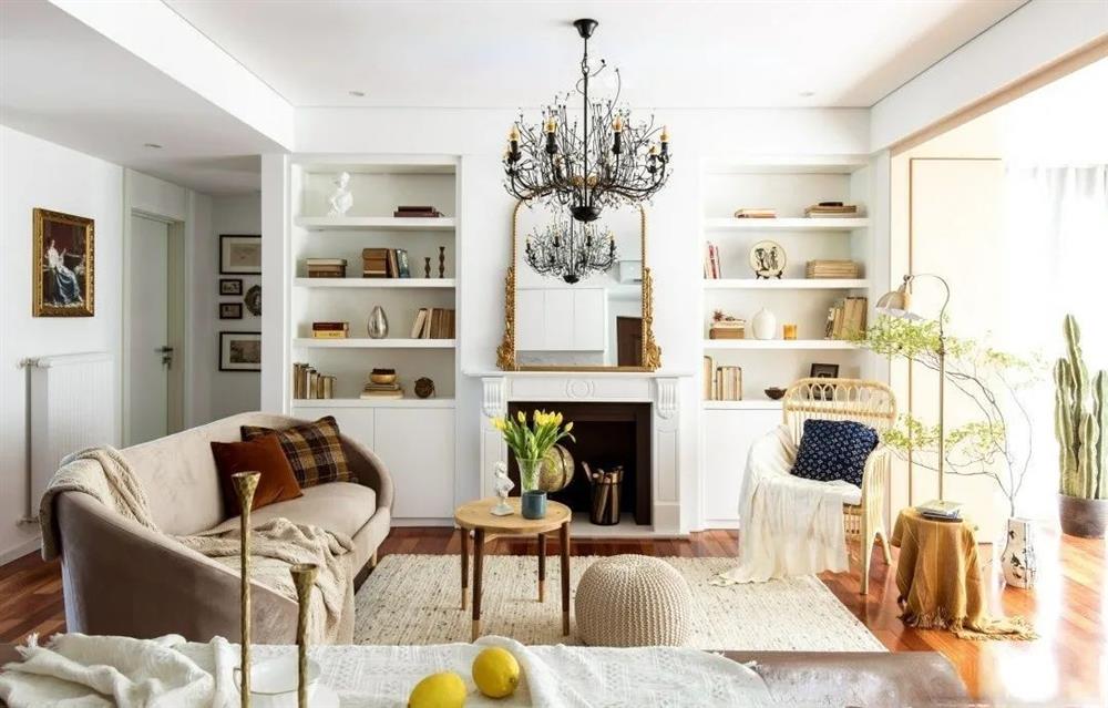Người phụ nữ trung niên này thích cảnh ngồi quây quần khi bạn bè đến thăm, do đó, phòng khách đã sử dụng ghế sofa, ghế đan lát và thảm trải sàn để tạo không khí tối đa.