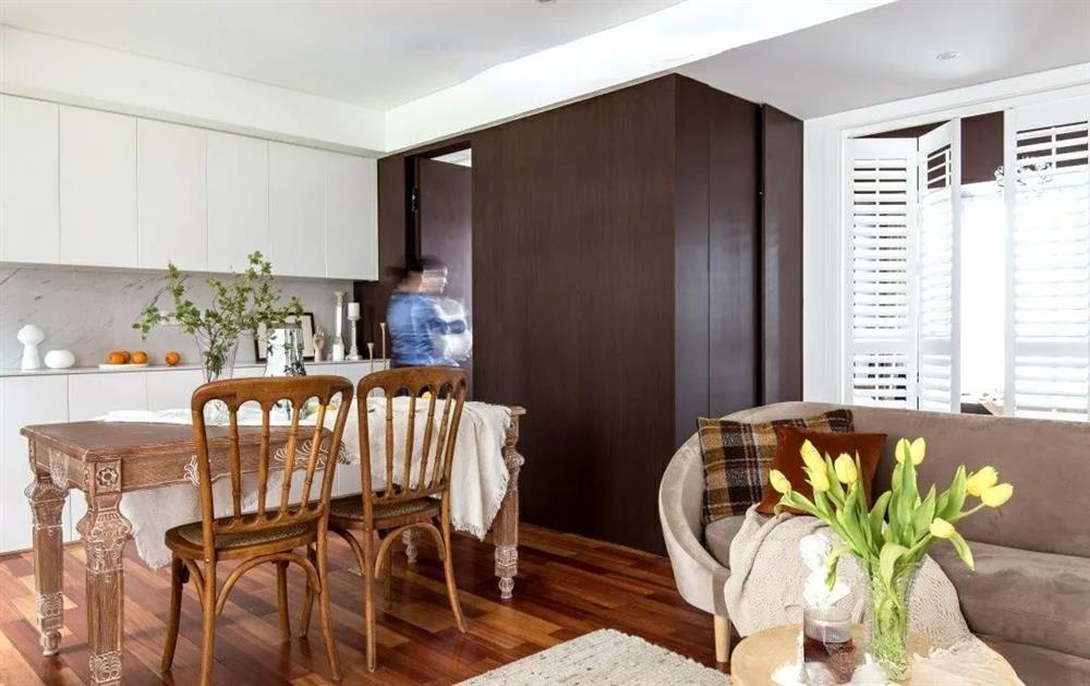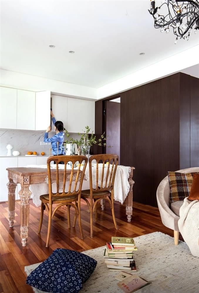 Tường nhà là những mảng tường lớn màu trắng thống nhất, trần nhà cũng là một thiết kế đồ họa đơn giản, không phức tạp. Sau khi phòng ăn dành cho khách và khu vực ban công được mở ra, ánh sáng trong toàn bộ phòng khách đã sáng hơn trước rất nhiều.