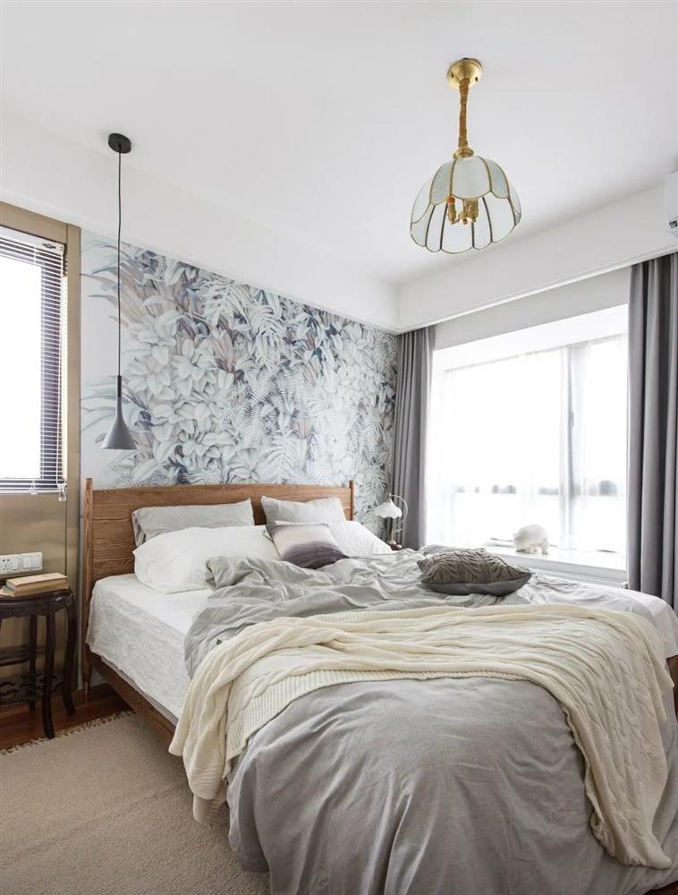 Giấy dán tường in màu tím xám có độ bão hòa thấp ở bức tường đầu giường làm tông màu xám của toàn bộ phòng ngủ, tạo cho người nhìn cảm giác hoài cổ và yên tĩnh.
