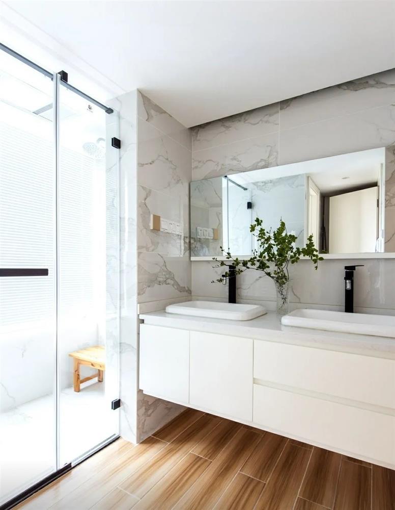 - Hai phòng tắm được hợp nhất với nhau để duy trì bồn rửa đôi và phòng tắm đôi.