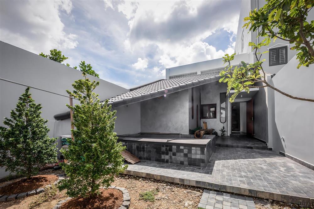 Ngôi nhà được chia thành nhiều khối với chiều cao khác nhau để tránh sự lặp lại trong một không gian quá dài. Toàn bộ ngôi nhà ưu tiên sử dụng gạch lát màu xám kết hợp với màu sơn ngoại thất trắng, nên khi ánh nắng chiếu qua giếng trời soi xuống nhà, thoạt nhìn như con người đang đứng dưới bể bơi.