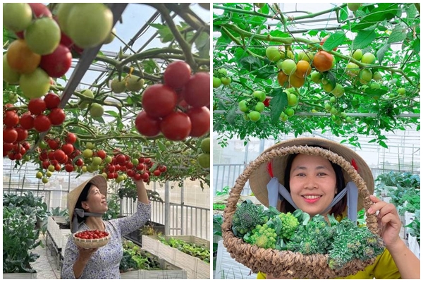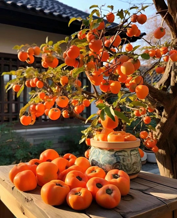 Vào mùa thu, trái cây trĩu quả, những quả hồng vàng đỏ treo trên cành càng làm tăng thêm màu sắc và sự thú vị cho sân vườn.