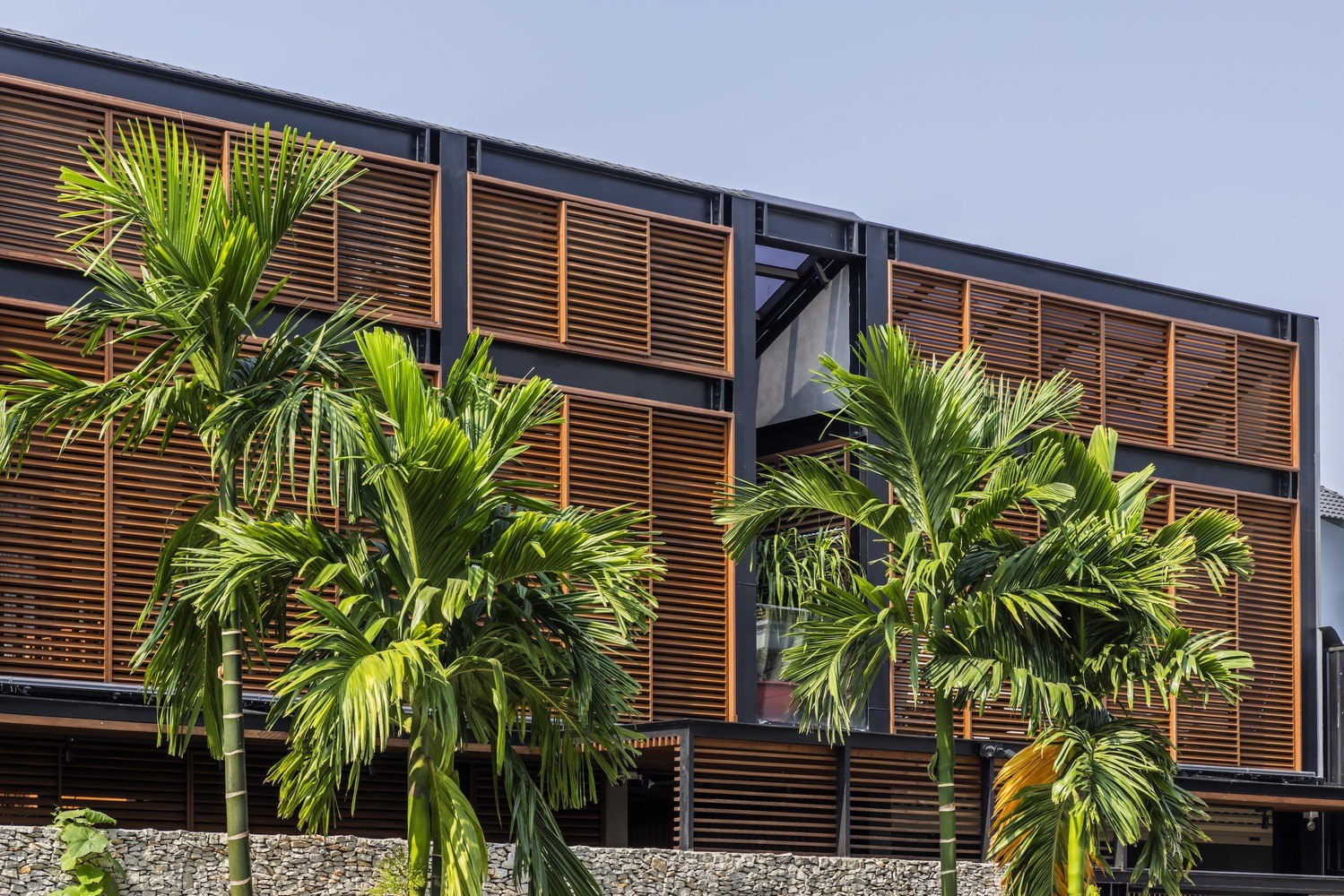 Để đáp ứng nhu cầu của gia chủ, các kiến trúc sư đã triển khai giải pháp thông minh mang tên “Mặt tiền hai lớp”. Cấu trúc này bao gồm hệ thống lam gỗ cách nhiệt (gỗ đã được xử lý nhiệt để tăng độ bền) ở bên ngoài, kết hợp với hệ thống kính trượt bên trong.