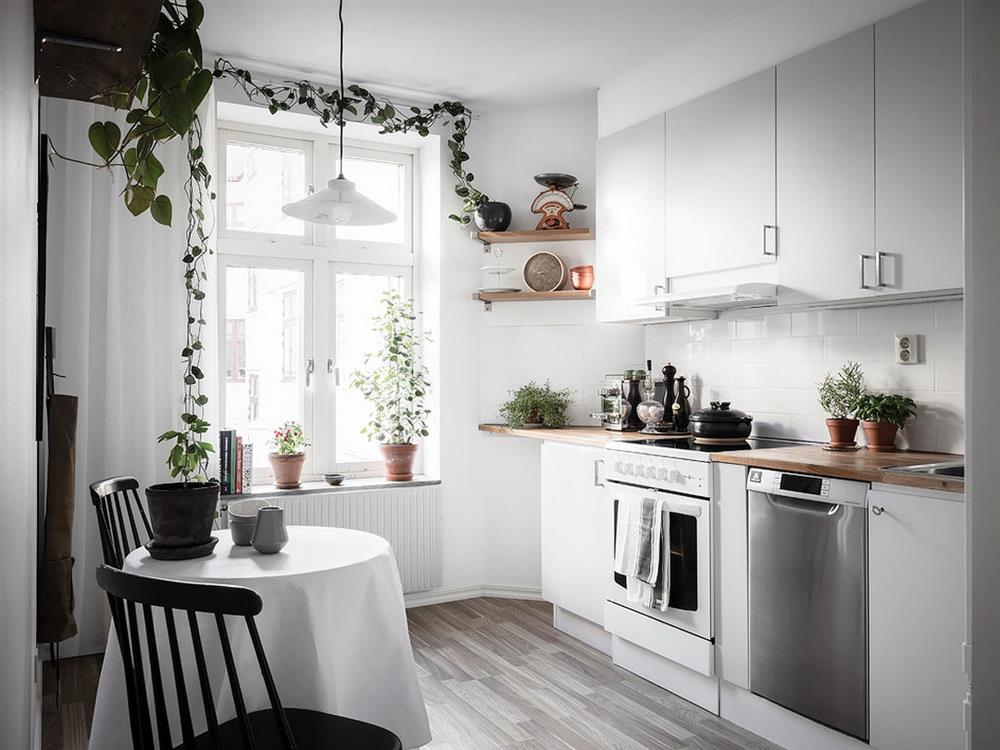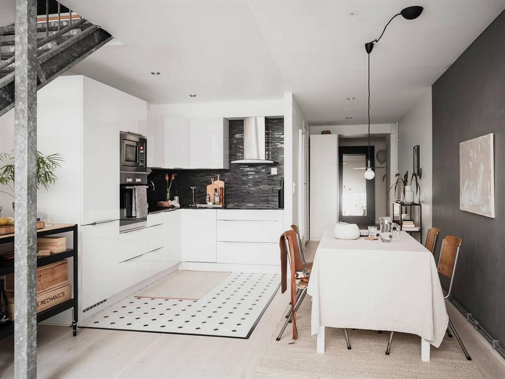 Phòng bếp được trang trí bằng các món đồ nội thất màu trắng, đem tới cảm giác sạch sẽ, gọn gàng và rất hiện đại