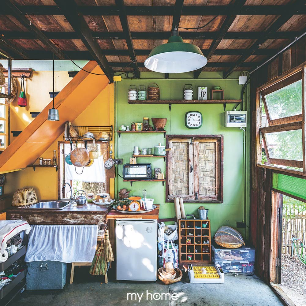 Phòng bếp cũng được trang bị sẵn bộ kiềng bếp dễ dàng lắp đặt. Chất liệu được sử dụng làm bề mặt chạm gỗ cho màu sắc và hoa văn tương tự như bức tường của ngôi nhà, làm cho tâm trạng trông có sự kết nối tốt.