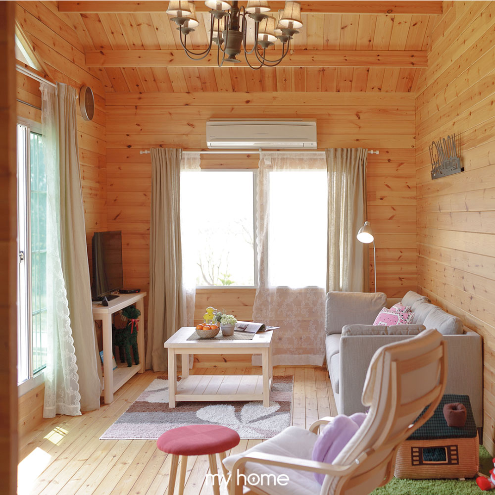 Mặc dù ngôi nhà này nhỏ gọn nhưng khi bước vào bên trong thì có sự ngăn chia phòng theo tỷ lệ. Với những bức tường và cấu trúc bằng gỗ thông cho thấy khung mái bằng gỗ sáng màu, giúp căn phòng trông cao và thoáng hơn.