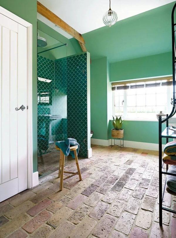 3. Một xu hướng mới xuất hiện trong năm 2023 là sử dụng gạch đất nung trong phòng tắm. Mặt sàn bằng gạch đất nung đem đến sự tiếp xúc thoải mái khi đi chân trần. Ngoài ra, loại gạch này cũng đem tới không gian phòng tắm cảm giác mộc mạc, thân thiện với môi trường.