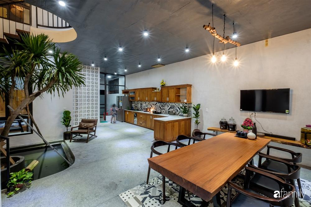 Ngôi nhà tạo ấn tượng đặc biệt không chỉ nhờ trần bê tông, sàn đẹp thoáng cùng tông với màu của tường mà còn tăng nét ấm áp và gần gũi với vật liệu gỗ, gạch từ nội thất, vật dụng. Ánh sáng luôn là yếu tố quyết định giúp cho tổng thể trở nên quen thuộc, ưa nhìn.