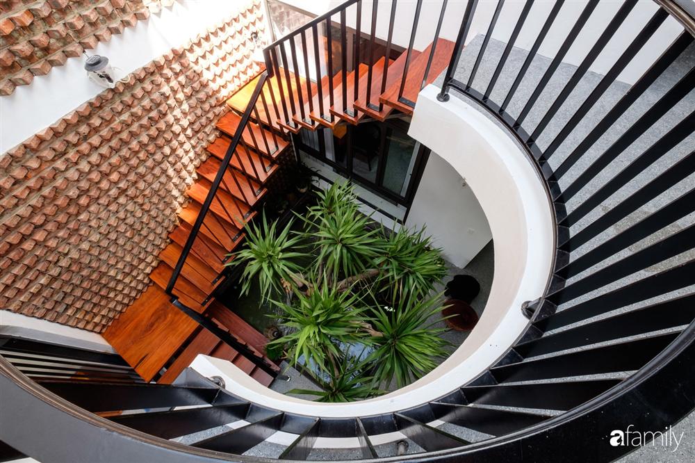 Giếng trời được trồng thêm cây xanh. Bức tường dọc cầu thang được thiết kế với gạch nung tăng thêm hiệu ứng trang trí thẩm mỹ vô cùng đẹp mắt.
