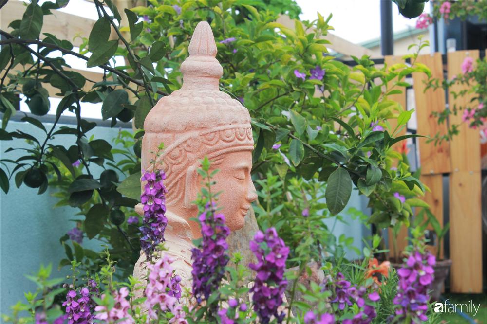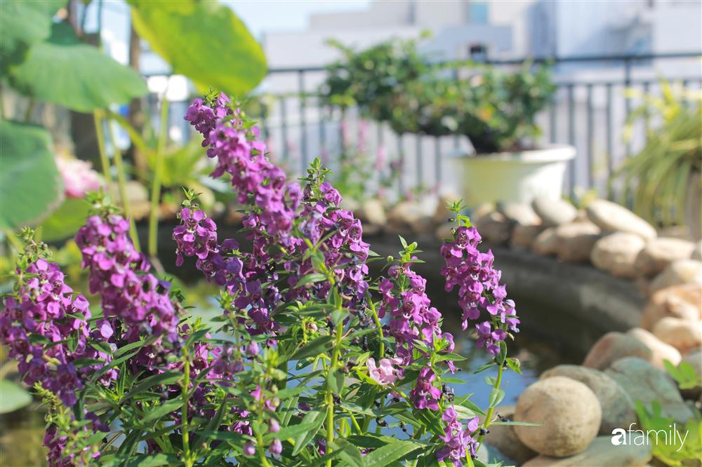 Khoảng sân thượng với diện tích không quá rộng nhưng vẫn đủ để anh thiết kế khu vực bể cá, nơi trồng sen súng, khu vực thảm cỏ, lối đi, các không gian trồng cây cỡ lớn, chậu treo, những góc nhỏ trồng hoa... Tất cả đều hài hòa từ màu sắc đến bố cục.