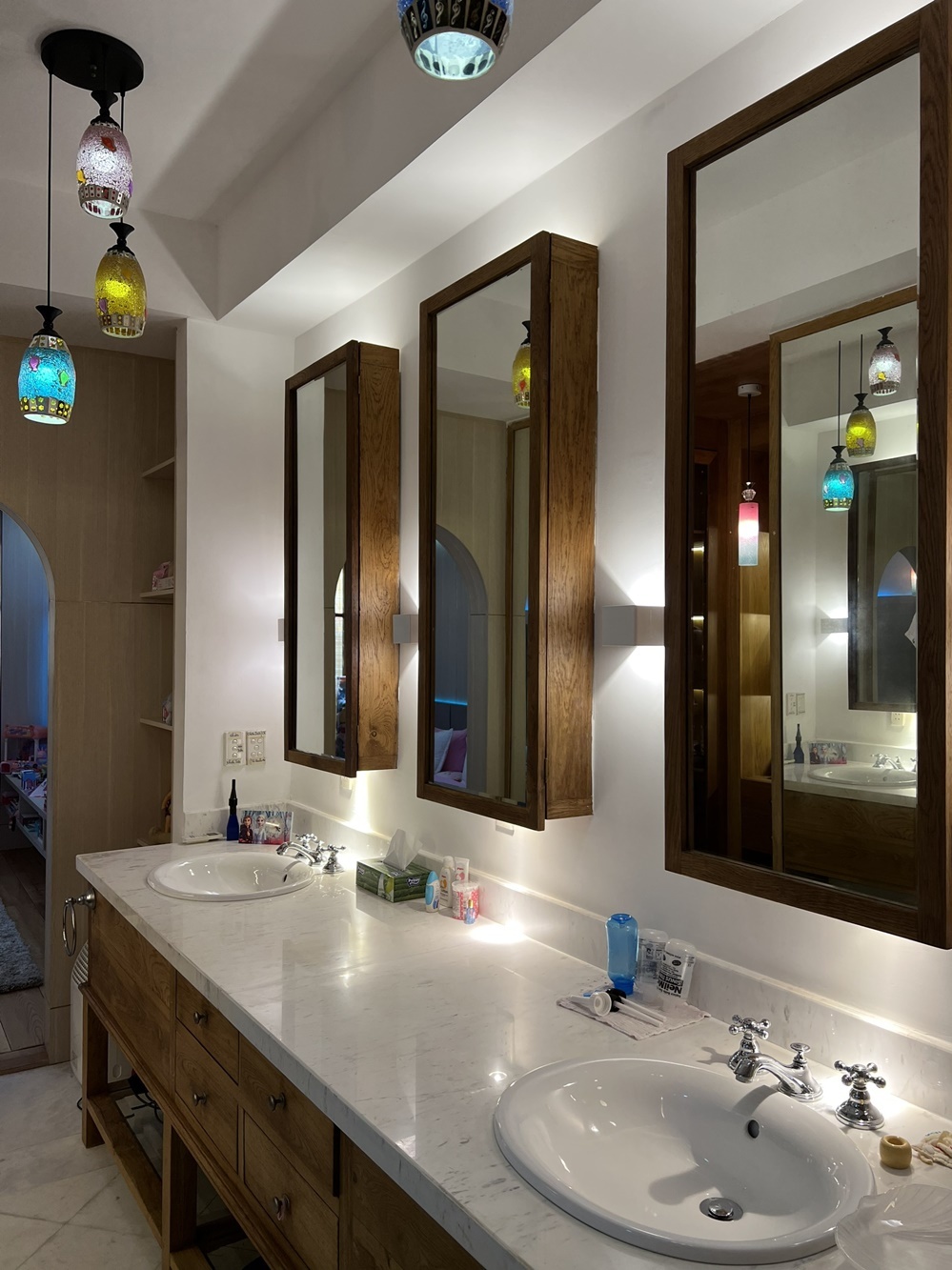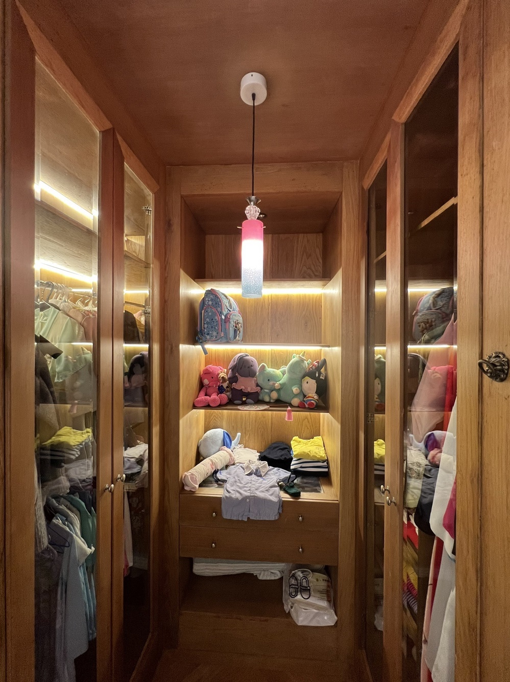Con gái Phan Như Thảo có khu thay đồ trong phòng ngủ, với hệ tủ chứa đầy quần áo, giày dép. Đại gia Đức An cho biết để sử dụng nội thất gỗ, anh tốn nhiều chi phí chống thấm hai lớp và gia cố tường. Ngoài ra, anh sử dụng toàn bộ gỗ thật thay vì gỗ công nghiệp để lát sàn, làm cửa, ốp trần. Theo anh, công đoạn này tốn kém, khiến tổng chi phí cải tạo phòng lên đến 200 triệu đồng.