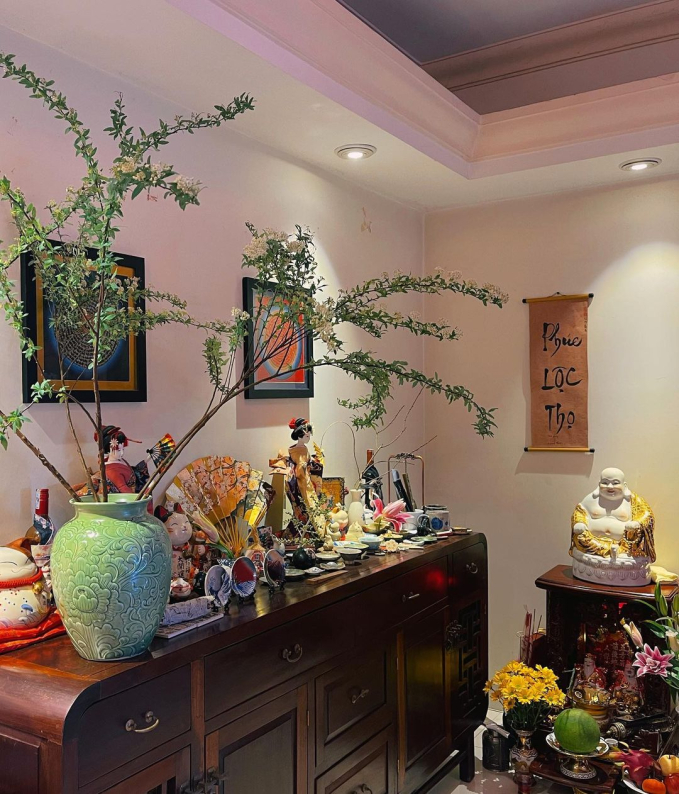 Trong không gian sống của mình, Phương Ly chọn cách decor rất độc đáo và bắt mắt. Cụ thể, hầu hết đồ nội thất trong nhà đều được làm bằng gỗ và có thiết kế mang đậm vẻ đẹp của Bắc Bộ. Ngoài ra, nữ ca sĩ còn treo thêm những chiếc chuông gió, đèn kiểu cách để tôn lên nét gần gũi và mộc mạc trong tổ ấm của mình. Ở phòng khách, Phương Ly đặt một bộ sofa màu xanh dương nổi bật tại chính giữa. Bàn thờ cũng được bố trí tại không gian này và hướng thẳng về phía ban công.