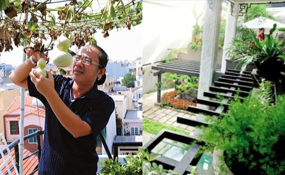 Nghệ sĩ Trung Dân tự chăm vườn rộng 30 m2 trên sân thượng với đủ loại rau, hoa.