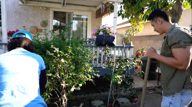 Mẹ Hồng Đào là người chăm sóc khu vườn giúp nữ nghệ sĩ mỗi khi bận rộn. Bà trồng các loại rau Việt Nam và tưới cho những khóm hoa như cúc, trà my, lồng đèn ở cả sân sau và sân trước.