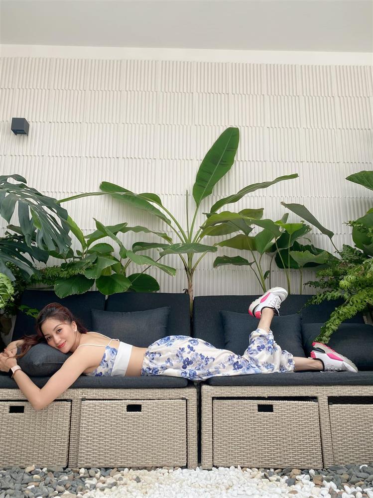 Khánh Thi khoe bức ảnh cô tắm nắng tại gia. Không gian tràn ngập cây xanh ở nhà của Khánh Thi - Phan Hiển khiến fan trầm trồ.