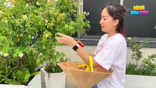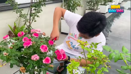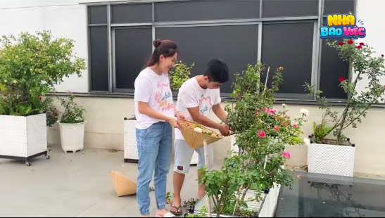 Cặp đôi dành thời gian chăm sóc khu vườn hoa hồng trong những ngày ở. (Ảnh cắt từ clip nhân vật)