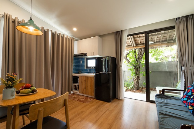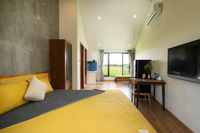 Hai trong số ba căn phòng cho thuê có ban công nhìn trực tiếp ra ruộng lúa thênh thang. Mỗi phòng đều có nhà vệ sinh riêng biệt, giường ngủ lớn, tivi lớn, có khu bếp riêng với đầy đủ trang bị: Bếp, lò vi sóng, tủ lạnh, kệ tủ bếp và bàn ăn cho 2 người.