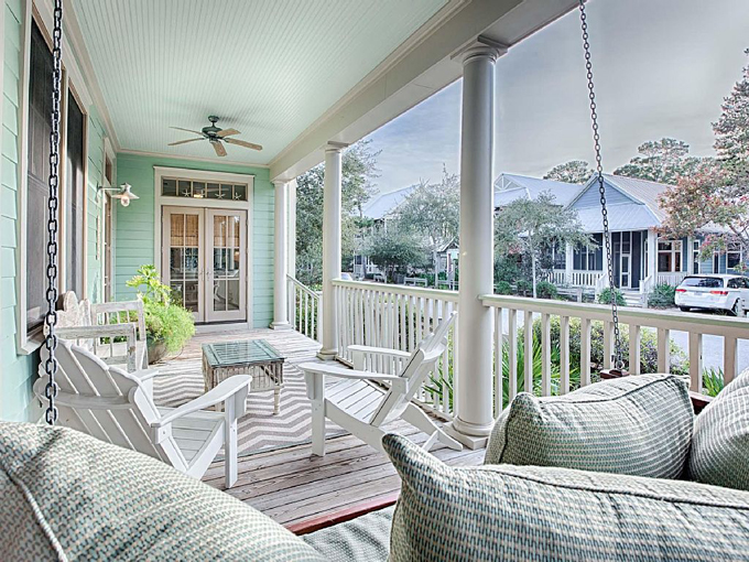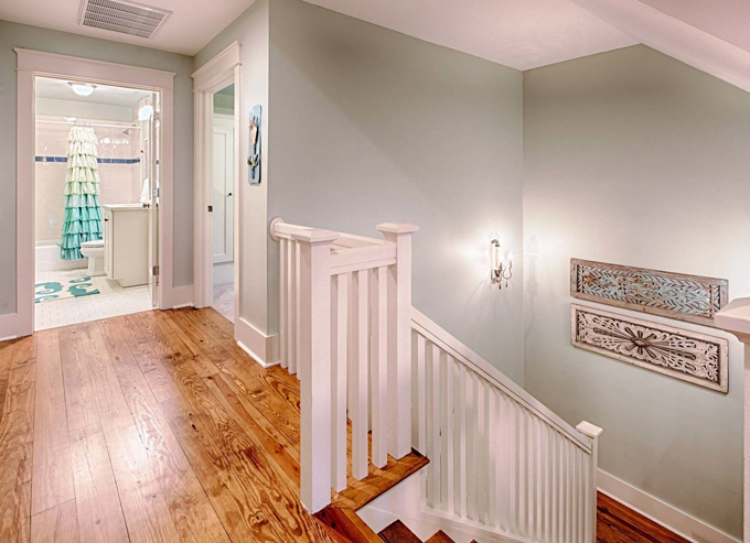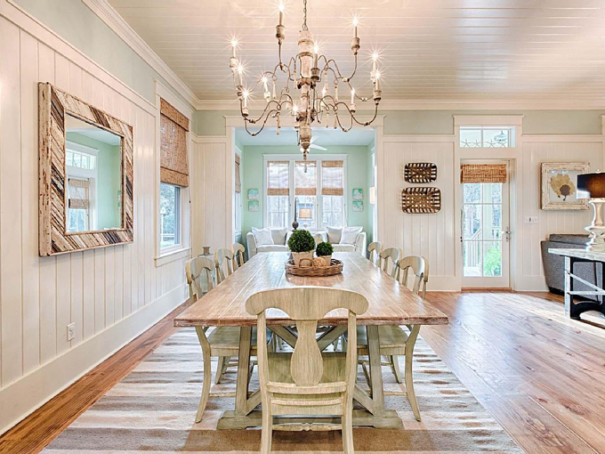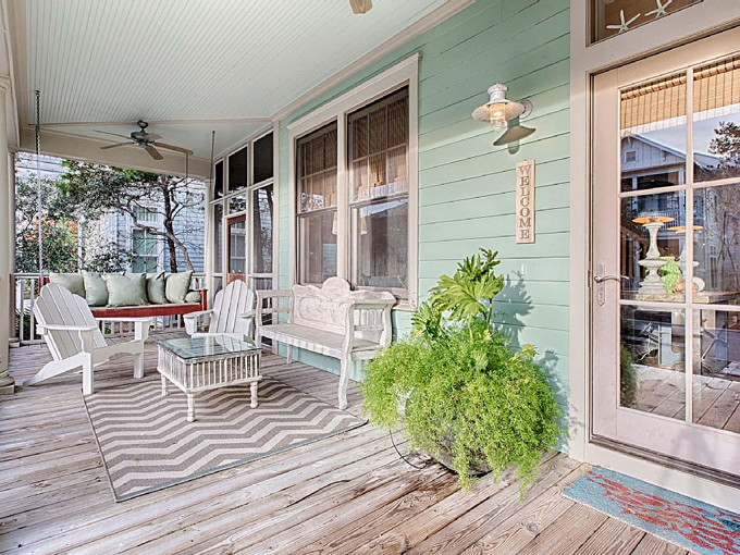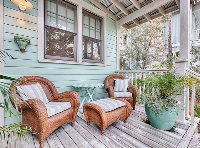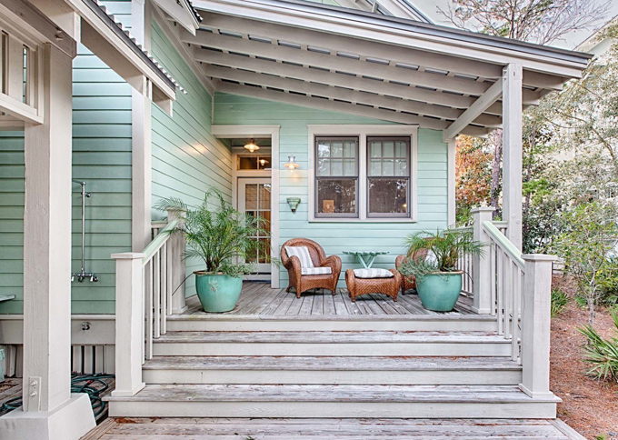 Khác với những căn nhà cấp 4 thường thấy, căn nhà này được tạo nên từ gỗ nhưng theo một phong cách hiện đại, mới mẻ. Toàn bộ ngôi nhà được phủ bằng các gam màu sáng trung tính: Tường màu kem kết hợp với màu xanh ngọc, cùng với mái hiên màu xanh lá cây, khiến ngôi nhà trông thật nổi bật, nhưng cũng tạo cảm giác nhẹ nhàng, thanh lịch. Phía trước nhà được trồng nhiều cây xanh, mang lại sự hài hoà, thư thái trong tâm hồn