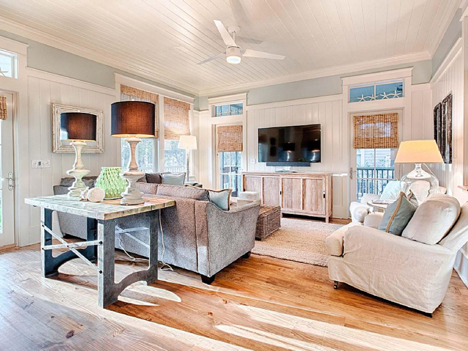 Màu chủ đạo của nhà là gam màu trắng và xanh, sàn được lát bằng gạch vân gỗ mang lại cho không gian sự sáng sủa, sạch sẽ. Phòng khách thiết kế đơn giản, chiếc bàn bằng mây tre đan tạo ra điểm nhấn độc đáo cho căn phòng.