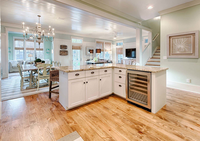Phòng khách và phòng bếp thông nhau, làm giảm cảm giác bức bối, giúp không gian trông rộng rãi hơn. Những chiếc ghế bằng mây tre tạo ra sự khác biệt trong không gian hiện đại của gian bếp.