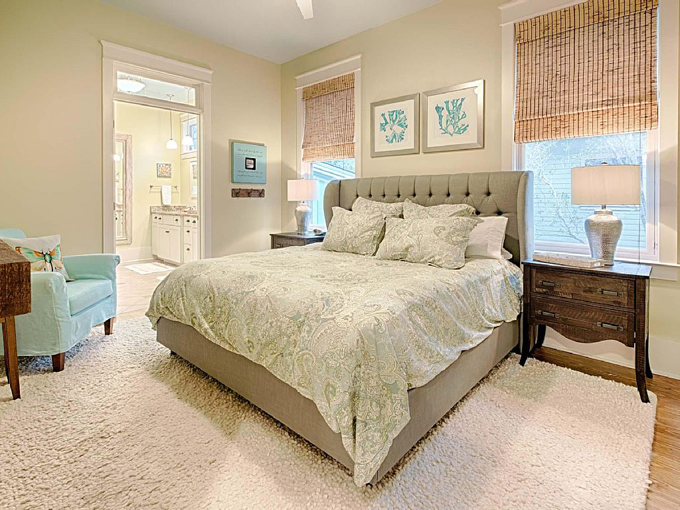 Đồ nội thất trong phòng ngủ đơn giản, bộ ga gối trải giường họa tiết hoa văn màu xanh dịu, mang tới cảm giác nhẹ nhàng, dễ chịu.
