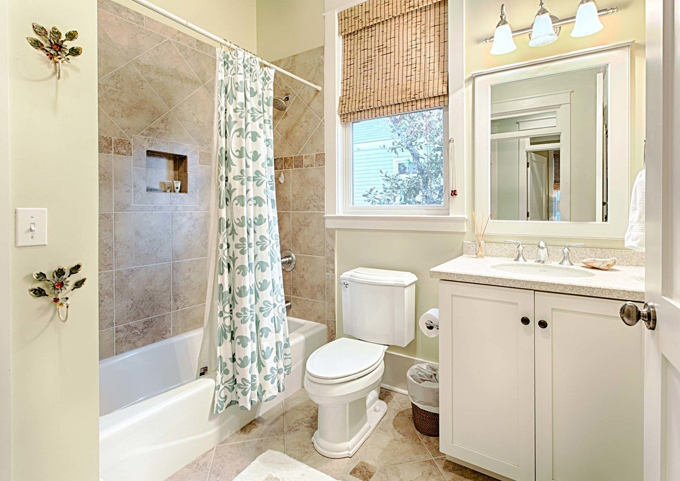 Nhà vệ sinh sạch sẽ, hiện đại, rèm phòng tắm có màu xanh mát mắt.