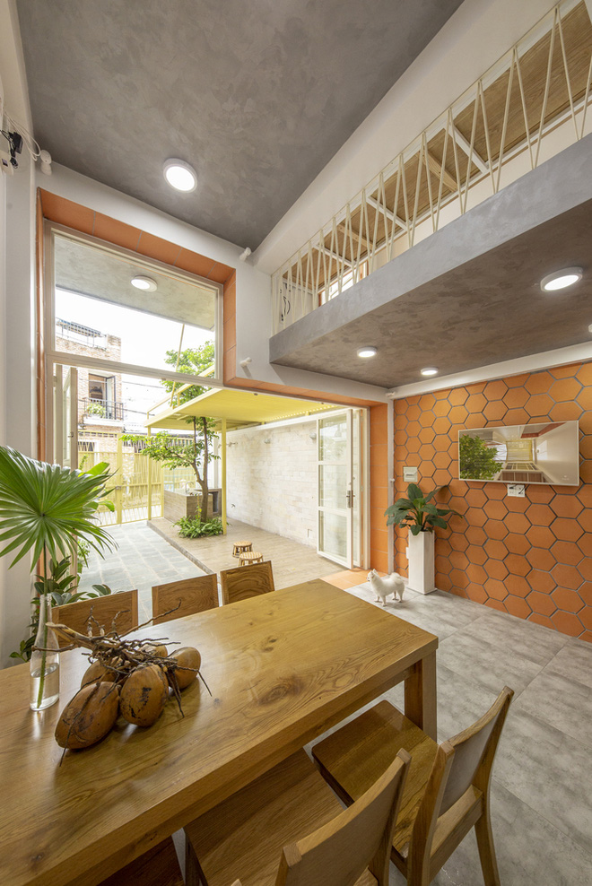 Mặt trước của ngôi nhà đa tầng năng động gây ấn tượng bởi những ô ban công và khung cửa sổ được sơn màu vàng so le nhau. Kiến trúc sư của căn nhà - anh Tuấn chia sẻ: "Độ cao về mặt thị giác khá phức tạp, vì vậy chúng tôi đã cố gắng cân bằng điều này bằng cách sử dụng màu sắc". Bên cạnh đó, ưu tiên của chủ nhà chính là xây dựng một không gian mở, tận dụng được tối đa không khí và nguồn ánh sáng tự nhiên. Kết quả căn nhà có một cấu trúc khá đơn giản, vuông vắn với khoảng giếng trời ở giữa nhà và đặt lên trên cùng là hệ mái tôn hai lớp. Cấu tạo hệ mái bao gồm hai lớp mái tôn chồng lên nhau để trống ở giữa, khe trống này giúp căn nhà lưu thông khí nóng hấp thu được từ mặt trời chiếu lên lớp mái trên cùng.