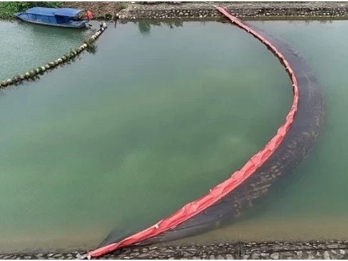 Những chiếc lưới lọc dầu đang được kỹ thuật viên của Trung tâm Ứng phó sự cố môi trường Việt Nam lắp đặt trước khi đưa xuống lòng hồ chứa.