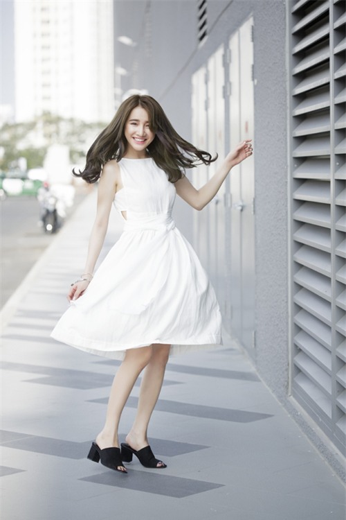 Chiếc váy xòe trong vắt kết hợp với guốc sục đen đơn giản là gợi ý tuyệt vời cho mùa hè mà Nhã Phương dành tặng người hâm mộ.