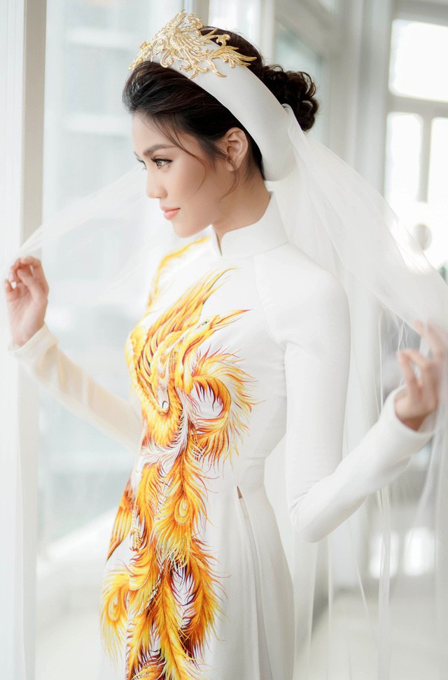 Trong ngày ăn hỏi, khác hoàn toàn với các cô dâu khác, Lan Khuê chọn riêng cho mình thiết kế áo dài trắng in hình cánh phượng quyền quý. Và đương nhiên tông trang điểm hợp với thiết kế áo dài cao sang này không gì khác là gam màu cam sáng nền nã. Khá nhiều người tinh ý nhận ra, bình thường rất hay chuộng son trầm đậm màu, nhưng đến ngày cưới Lan Khuê dịu dàng e ấp hơn hẳn với tông cam hiền dịu.
