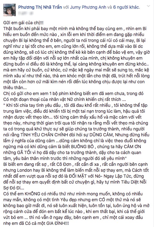 Vậy giờ em hãy tập đối diện với nỗi sợ lớn nhất của mình, chị không khuyên em đừng buồn vì điều đó là không thể, lại càng không khuyên em đừng khóc mà em hãy cứ buồn, cứ khóc, cứ mặc kệ ngày mai mắt sẽ sưng to, măc kệ mình xấu xí như thế nào, thà em khóc một lần cho thật đã, trút hết nỗi lòng một lần còn hơn cứ mãi kìm nén rồi đến lúc không chịu được lại như con thiêu thân.” – nữ diễn viên chia sẻ.