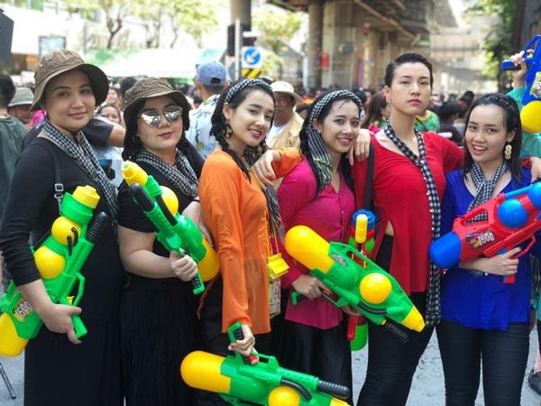 Nhã Phương ướt nhẹp sau khi "quậy banh nóc" trong Lễ hội té nước trên đường phố xứ sở Chùa Vàng.
