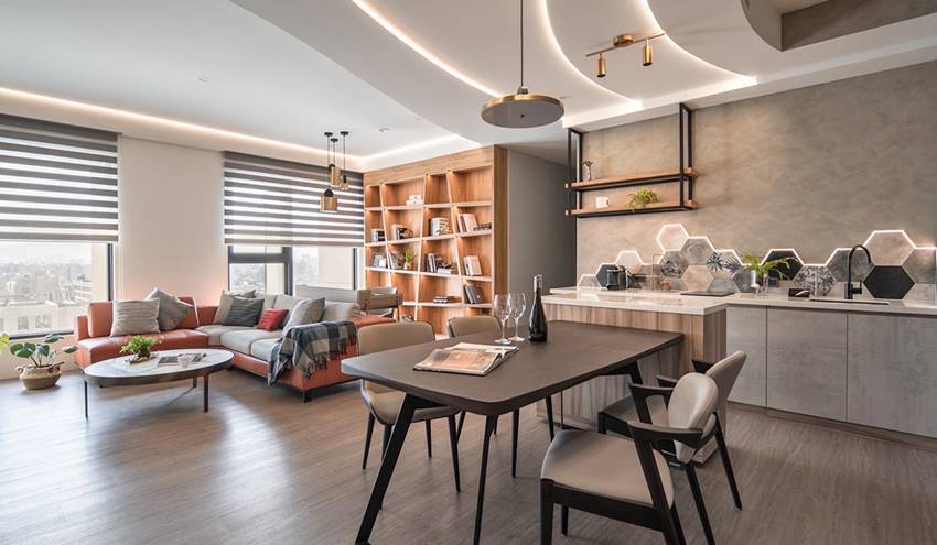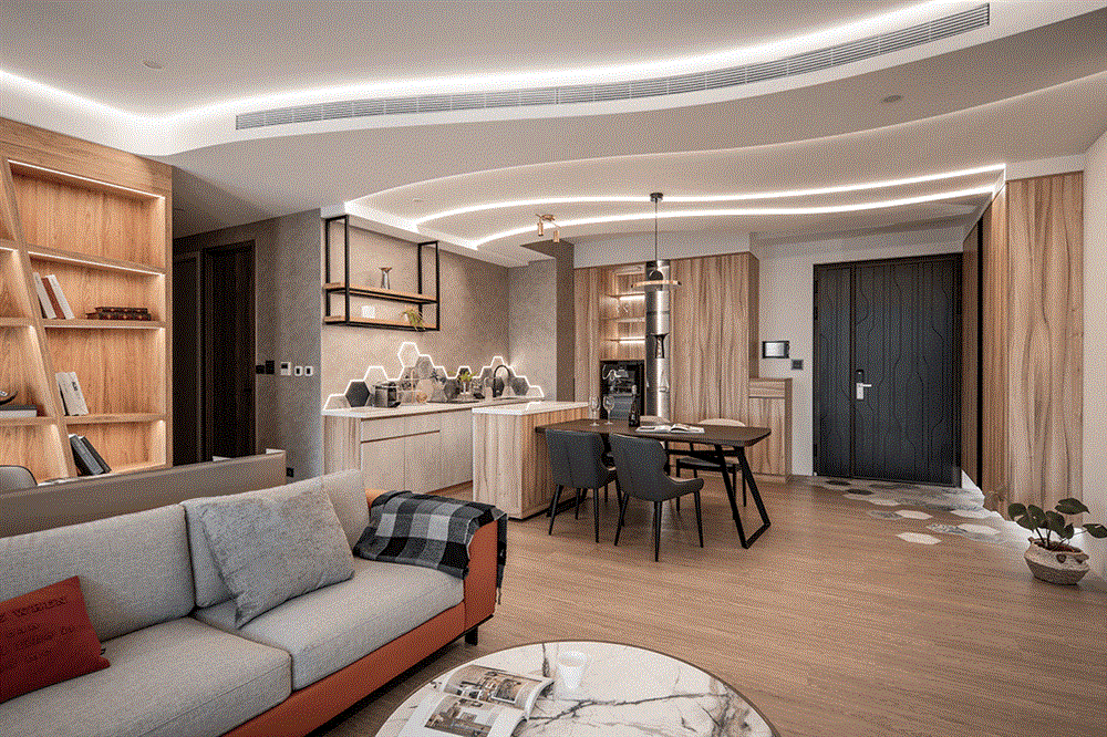 Ánh sáng là yếu tố quan trọng trong ngôi nhà. Nó có thể tạo ra hiệu suất thiết kế không đều, không đối xứng và đây là chìa khóa để tăng cường cá tính của không gian. Cụ thể, căn hộ này có thiết kế trần 2 lớp hình vòng cung mềm mại và lắp đặt đèn thông minh tạo ra một bức tranh động về những con sóng vỗ bờ vô cùng đẹp mắt.