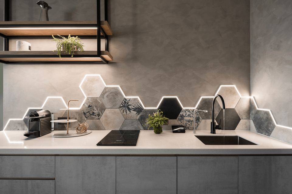 Bệ nấu nướng đặt bên hông nhà ăn nhưng tổng thể vẫn rất gọn gàng, sạch đẹp. Điểm ấn tượng nhất của không gian này nằm ở việc xếp chồng lên bức tường trát xi măng bằng các chi tiết sắt không theo tiêu chuẩn. Tấm ván chống giật được kết hợp độc đáo với gạch hình lục giác và đèn chiếu sáng thể hiện tính chiết trung của gia chủ trong cuộc sống.