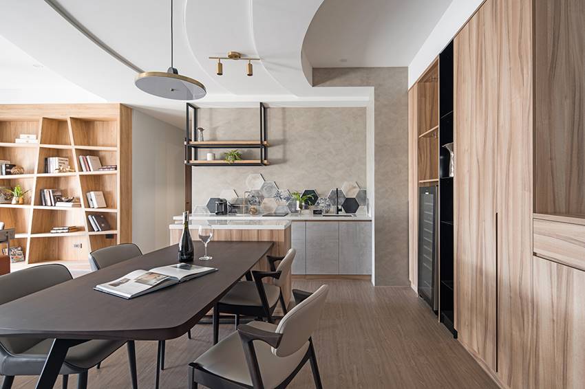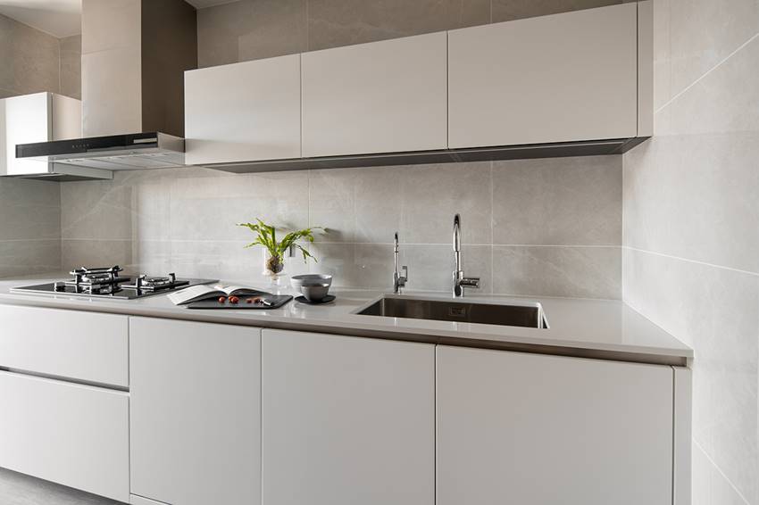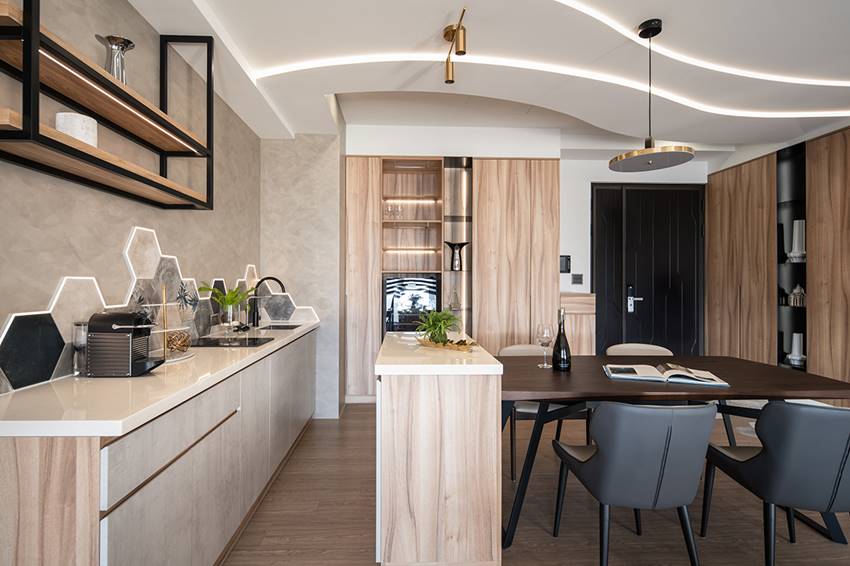 Nhà bếp độc lập đặc biệt xa khu vực công cộng, sử dụng ban công phía sau để giảm bớt mùi khói dầu. Dưới ánh sáng của đèn trần phẳng, các góc được chiếu sáng đều không có điểm mù, thể hiện nhịp điệu nấu nướng vui vẻ.