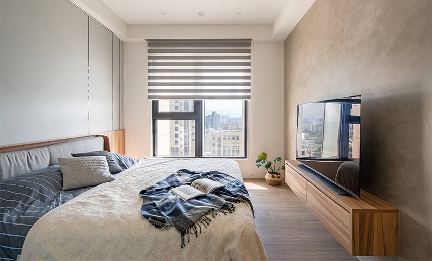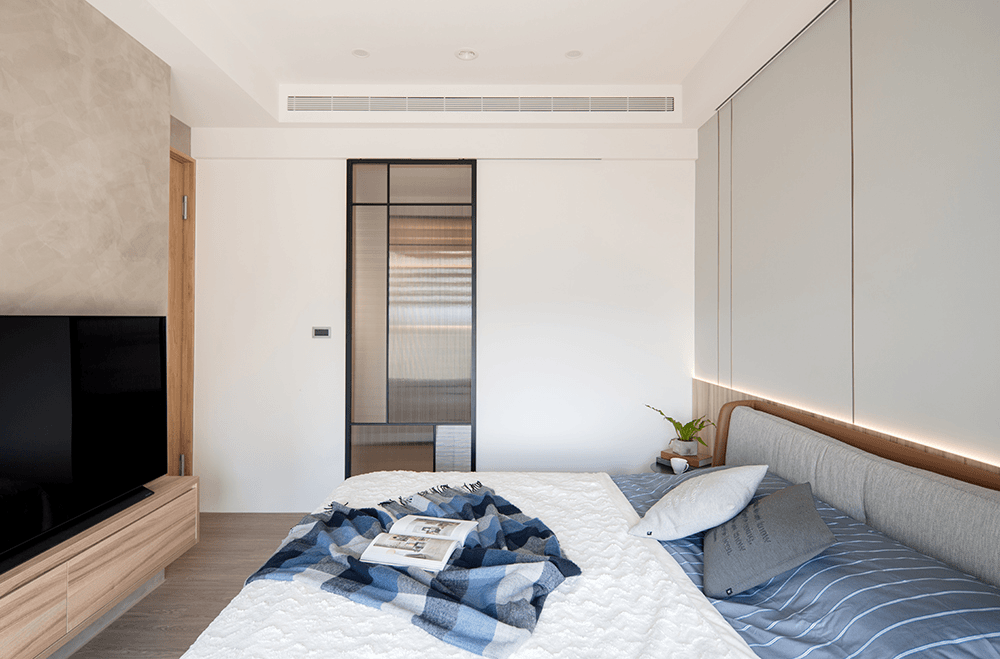 Vừa đẩy cửa bước vào, ánh sáng tự nhiên tràn vào phòng ngủ, phản chiếu bóng mờ của các dải mạ titan vào bức tường xi măng đằng sau TV, tạo thành một nét riêng, đơn giản mà trang nhã.
