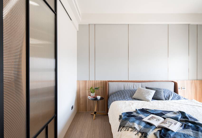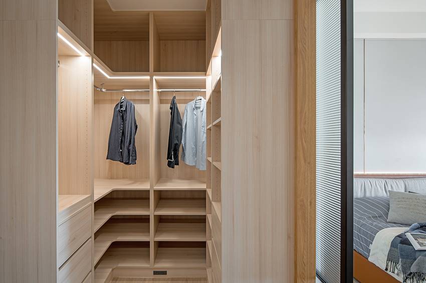 Để đáp lại mong muốn của gia chủ về phòng thay đồ, nhà thiết kế đã sử dụng cấu trúc phòng dài và phân chia thành nơi ngủ, khu thay đồ và phòng tắm. Cửa kính trượt giúp khuếch tán ánh sáng và bóng tối, thu hẹp sự tương tác trong một kênh duy nhất.