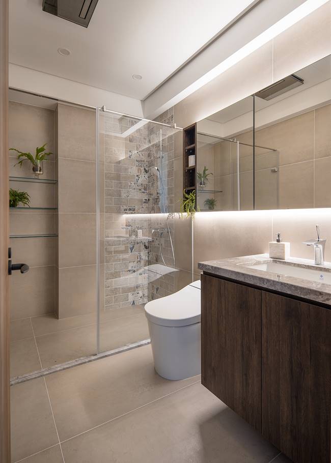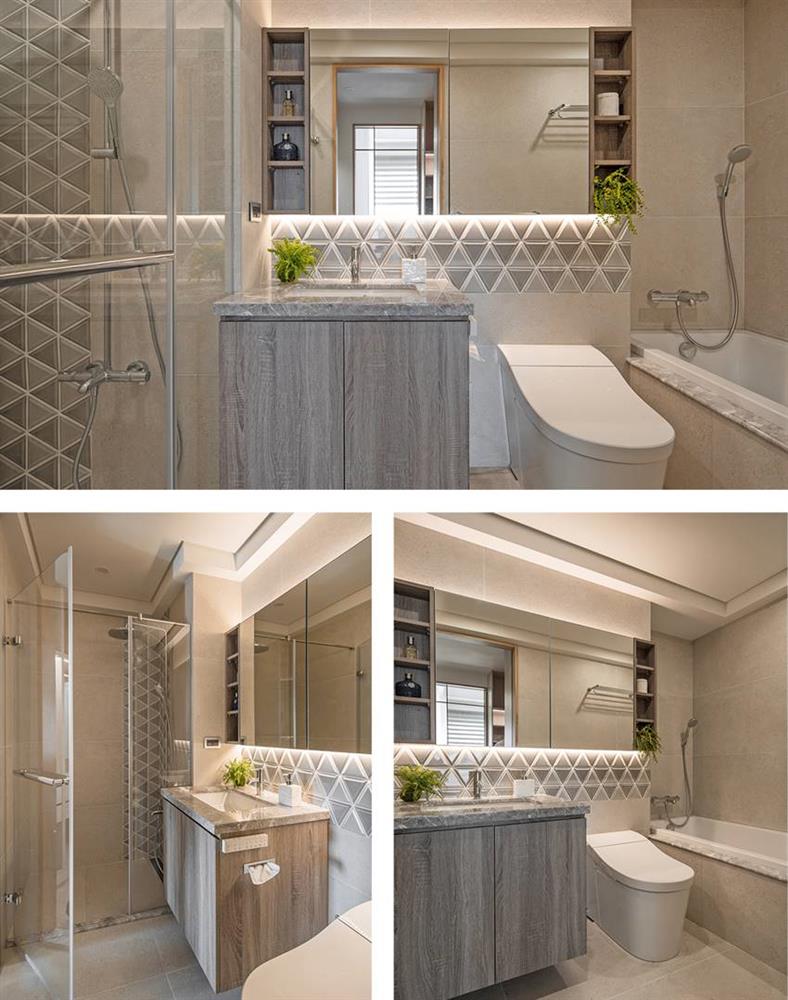 Làm thế nào để có một phòng tắm rộng trong khi diện tích căn nhà hạn chế là vấn đề chính. Do chủ nhà có yêu cầu về không gian giặt giũ, đặc biệt là phòng tắm chính được thiết thành bốn phần nên sau khi cân nhắc không gian và sự lưu thông, họ quyết định phân tán chức năng của khu vực ướt và sử dụng vòi hoa sen để lấp đầy bất thường nhằm mang lại trải nghiệm tắm thoải mái.