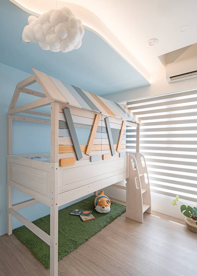 Tầm nhìn trẻ thơ được mở ra dưới sàn lát gạch màu xanh da trời. Đèn đám mây sẽ tô điểm thêm trí tưởng tượng về bầu trời xanh và những đám mây trắng, đồng thời sử dụng trần hình vòng cung để mở rộng ranh giới của bầu trời một mượt mà, cho phép khuếch tán ánh sáng dịu hòa cùng ánh sáng ban ngày… Không gian phòng ngủ mang dáng dấp của những ngôi nhà trên cây với khung giường độc đáo tươi sáng đẹp như trong mơ sẽ thắp sáng cho con những ký ức tuổi thơ đẹp nhất.