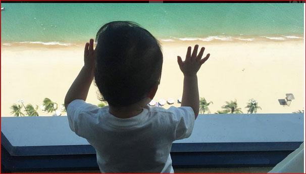 Không chỉ có mẹ, cậu con trai nhỏ xíu của Hà Tăng cũng khiến người hâm mộ phải xuýt xoa khi đứng ngắm cảnh biển Nha Trang qua khung cửa kính khách sạn