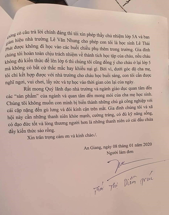Mới đây, một phụ huynh ở An Giang gây xôn xao cộng đồng mạng khi chị đã làm đơn xin nhà trường cho con không phải học thêm buổi chiều. Được biết, người mẹ dũng cảm này tên là Thái Thị Diễm Trúc, phụ huynh của một học sinh lớp 5A, Trường Tiểu học Lê Văn Nhung, thành phố Long Xuyên, tỉnh An Giang.