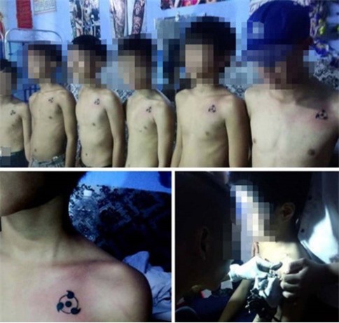 Theo hình ảnh, có khoảng 6 học sinh nam cùng xăm hình giống nhau ở bên vai trái, nhiều em khác thì đứng xem.