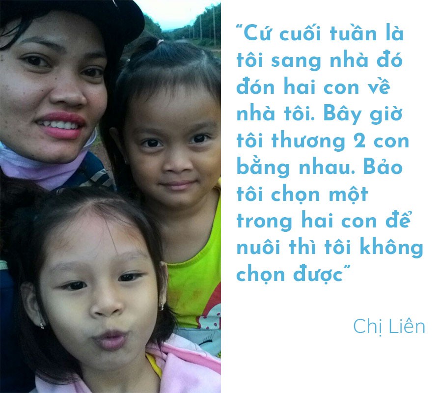 Hiện nay, 2 bé đều đi học mẫu giáo nên từ thứ 2 đến thứ 6, hai bé ở với vợ chồng anh Khiên để đi học chung lớp. Cuối tuần. hai bé về sống bên nhà chị Liên. Chị Liên tâm sự: "Bây giờ tôi thương 2 con bằng nhau. Bảo tôi chọn một trong hai con để nuôi thì tôi không chọn được. Bây giờ cứ sống vậy là vui. Sau này các con lớn sẽ có suy nghĩ, quyết định riêng".