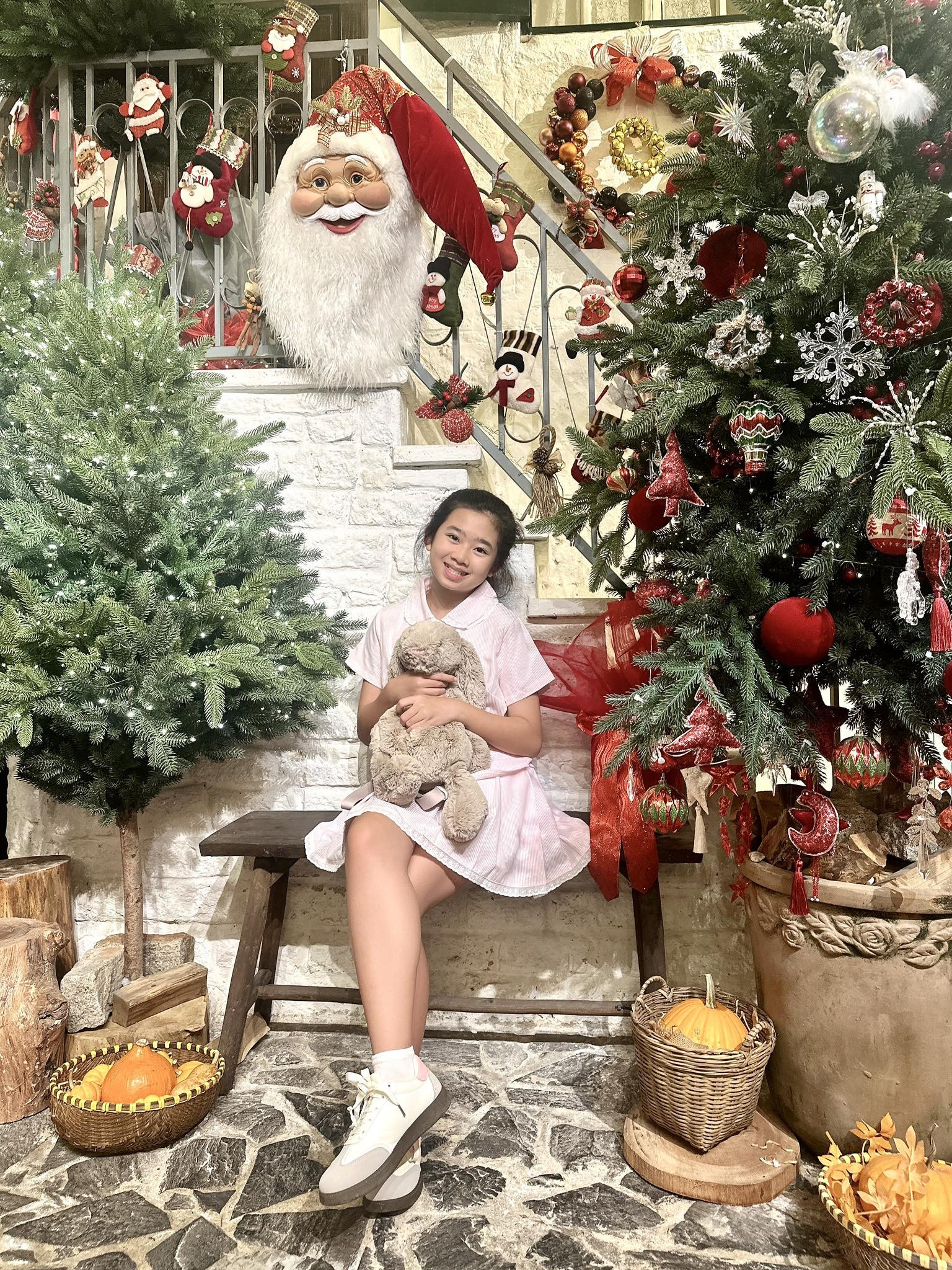 Trong hình, bé Lavie diện bộ đồ màu hồng nhạt, nở nụ cười cực tươi. Khung cảnh xung quanh trang trí theo không khí giáng sinh.